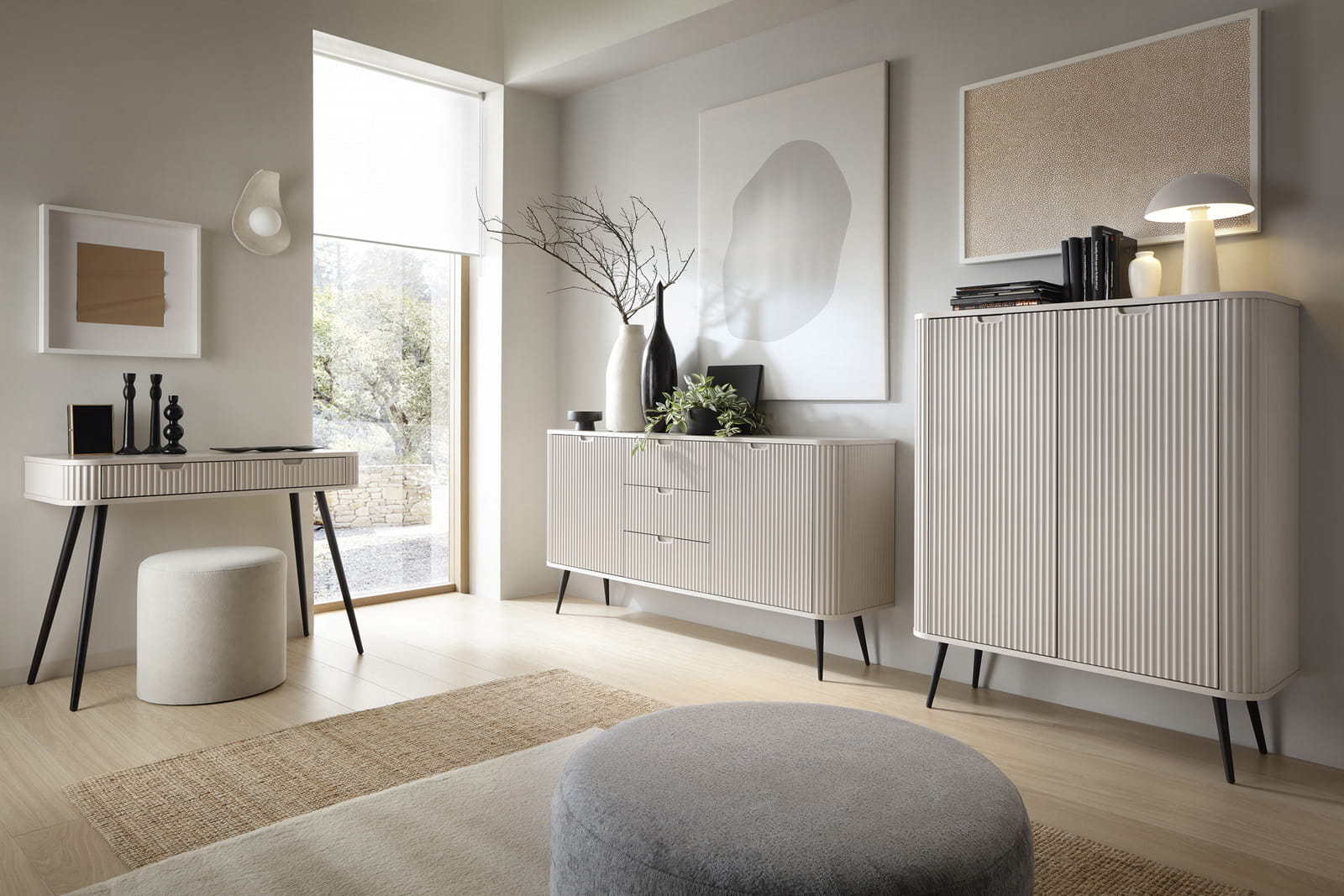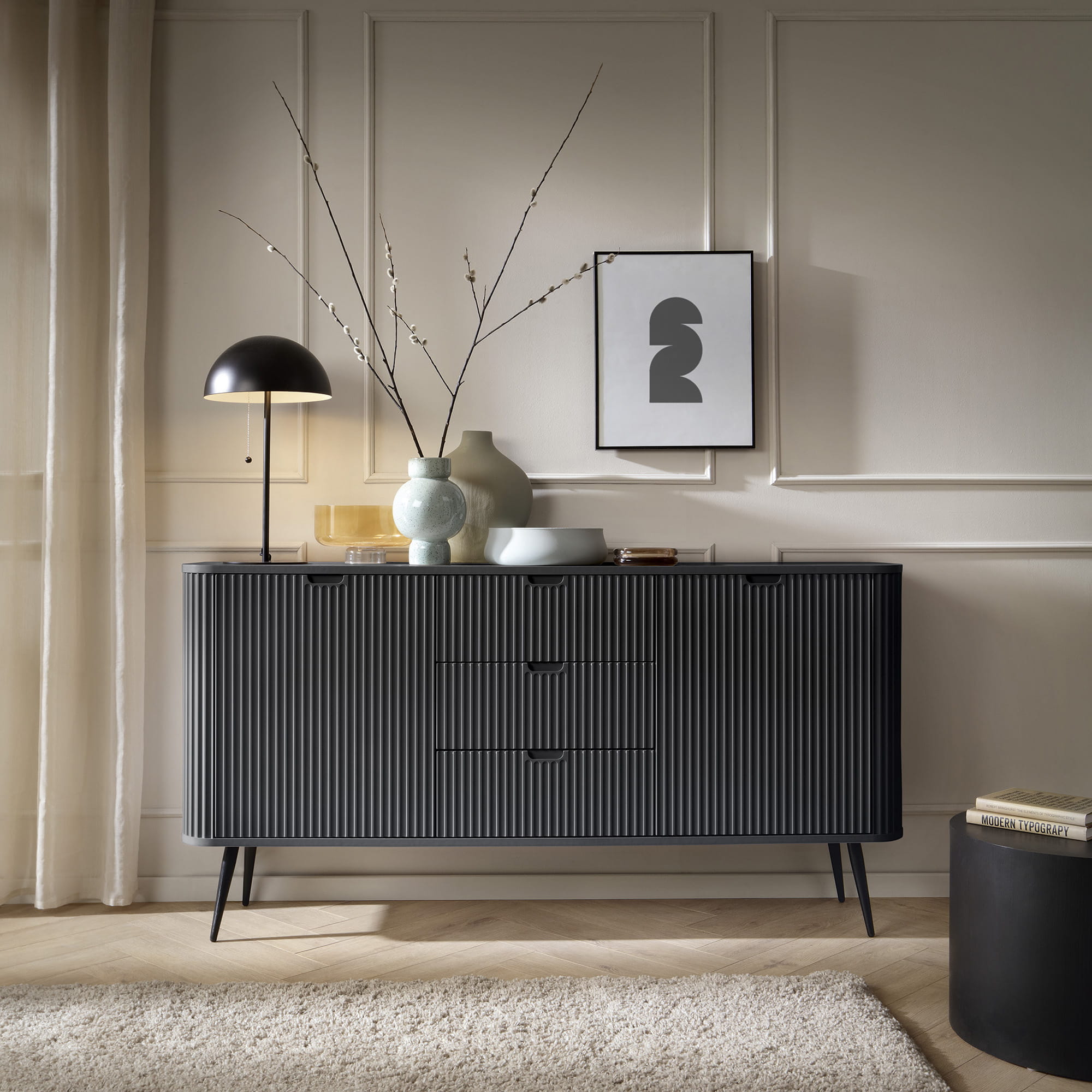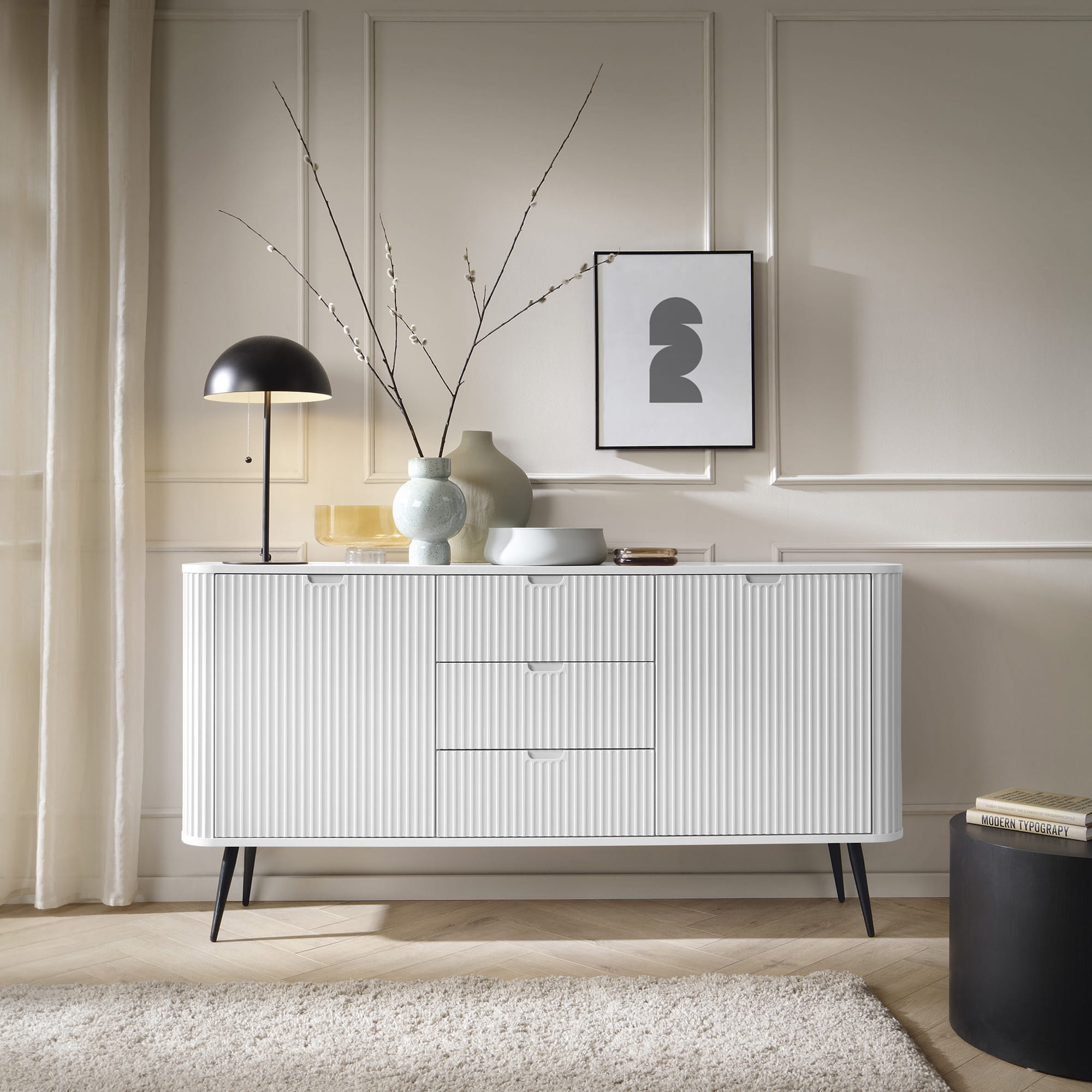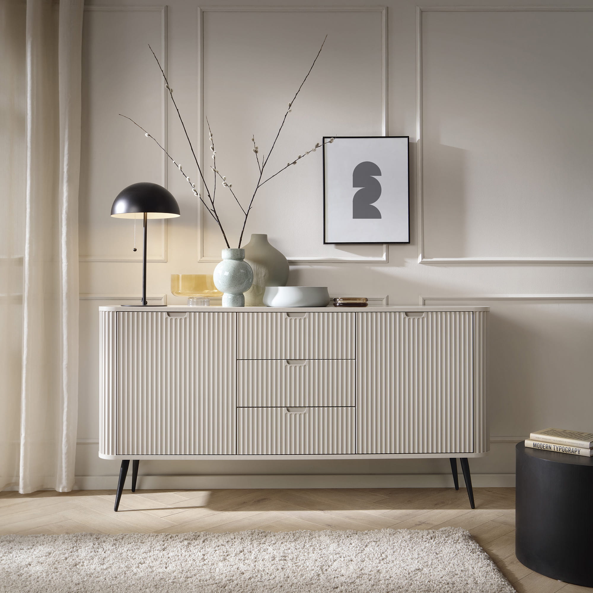 To, co natychmiast przyciąga wzrok, to charakterystyczne, ryflowane fronty. Pionowe frezowania nadają bryle głębi i sprawiają, że mebel reaguje na zmieniające się w ciągu dnia oświetlenie, tworząc w salonie czy sypialni wyjątkową grę cieni. Jeśli szukasz elementu, który zdefiniuje wnętrze i doda mu luksusowego sznytu, ta komoda ryflowana będzie strzałem w dziesiątkę, idealnie wpisując się w trendy modern classic oraz minimalistyczne.