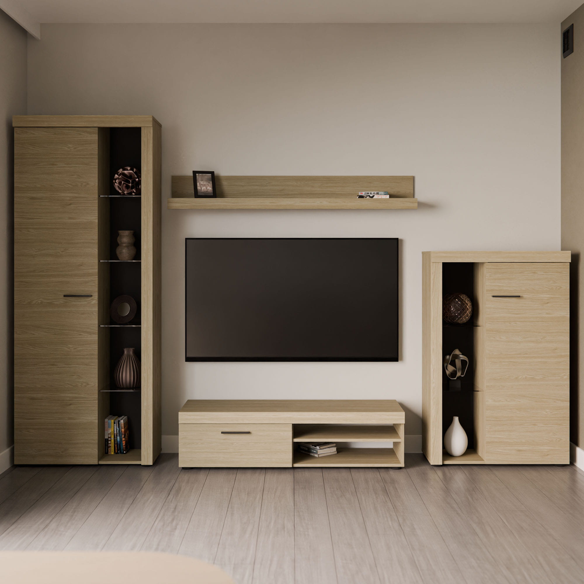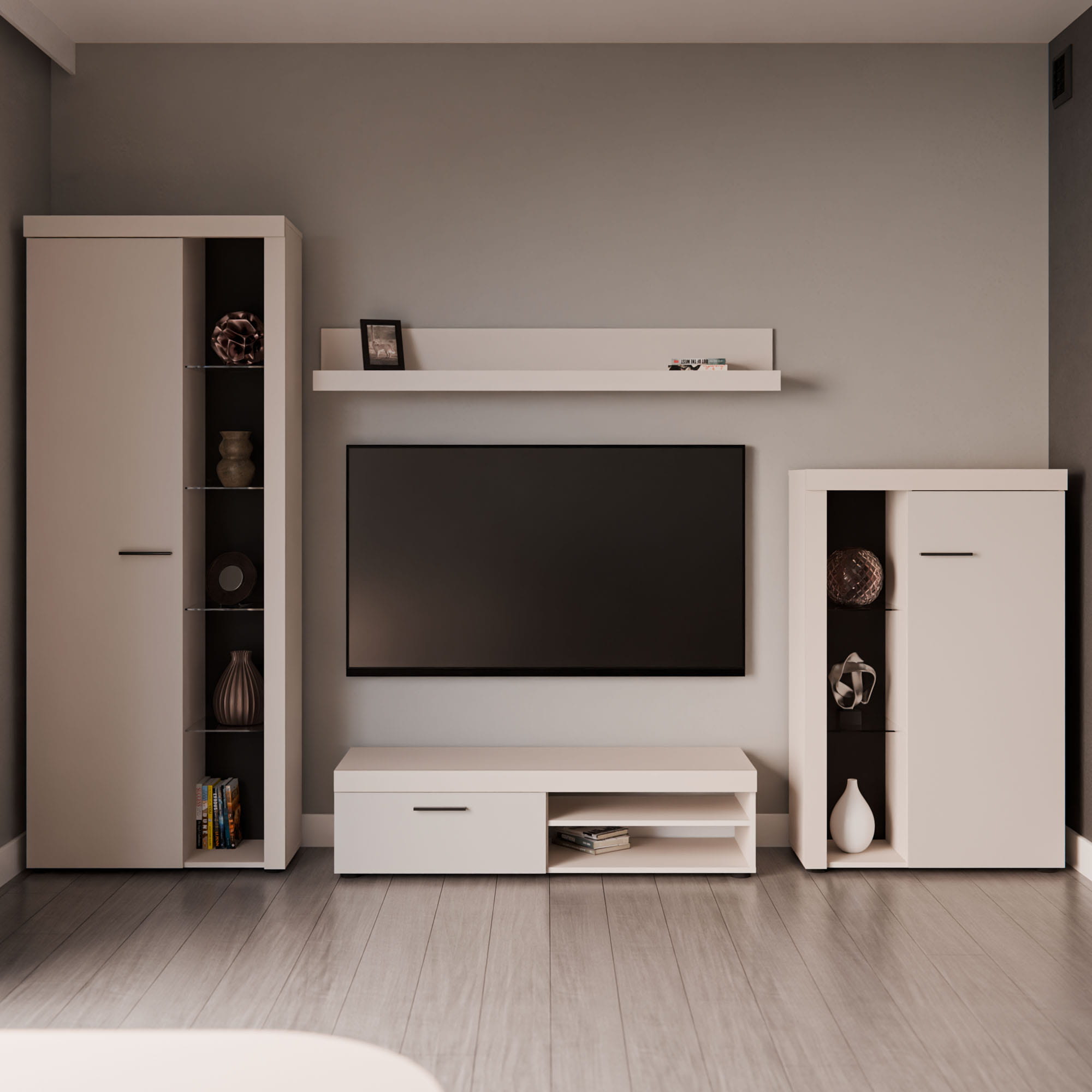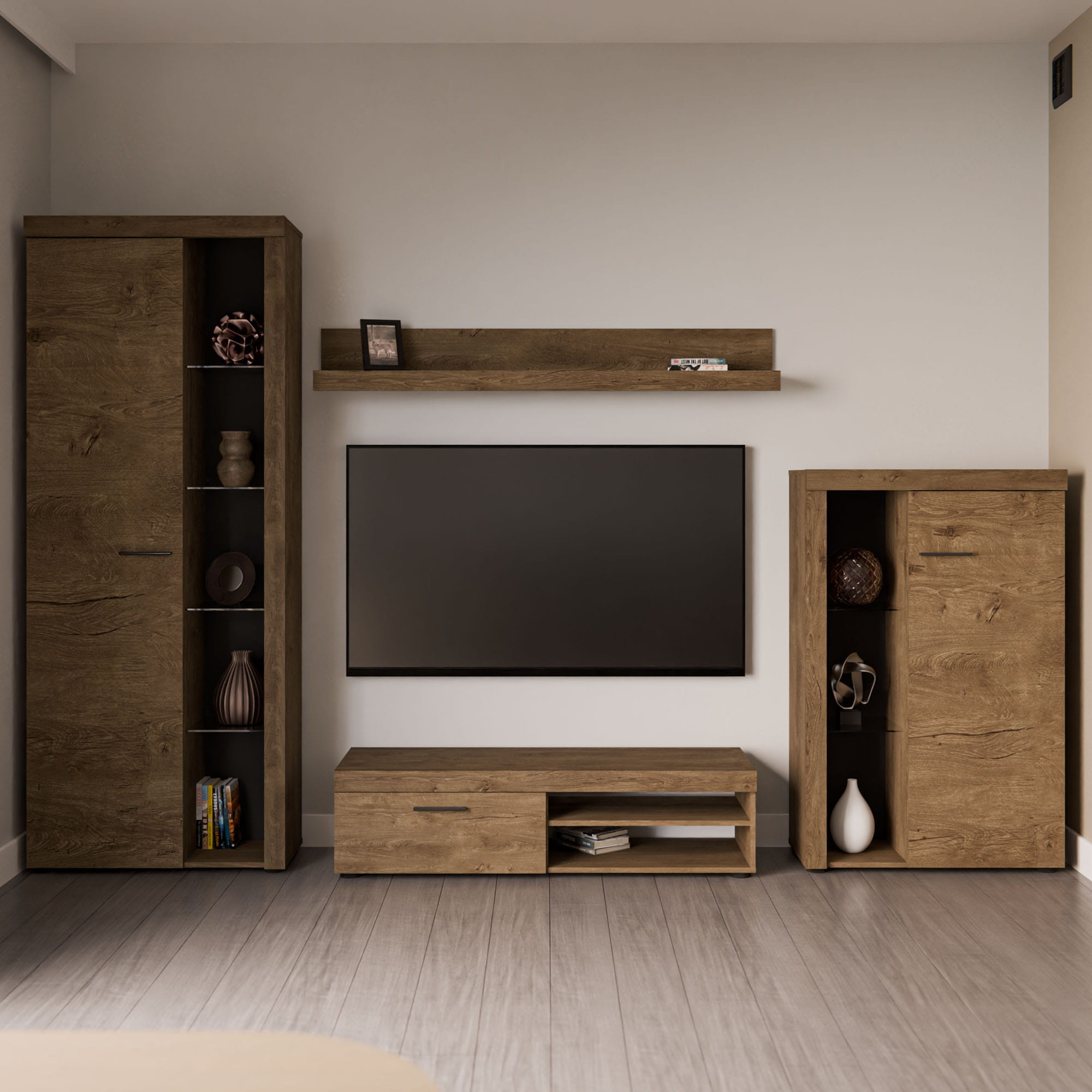 Aby dodatkowo podkreślić urok tych przedmiotów i zbudować w salonie przytulny, wieczorny klimat podczas oglądania filmów, zestaw możesz rozbudować o opcjonalne oświetlenie LED w kolorze białym. Układ zamyka klasyczna półka wisząca, która stanowi idealne miejsce na drobne ramki ze zdjęciami lub opadające rośliny doniczkowe.