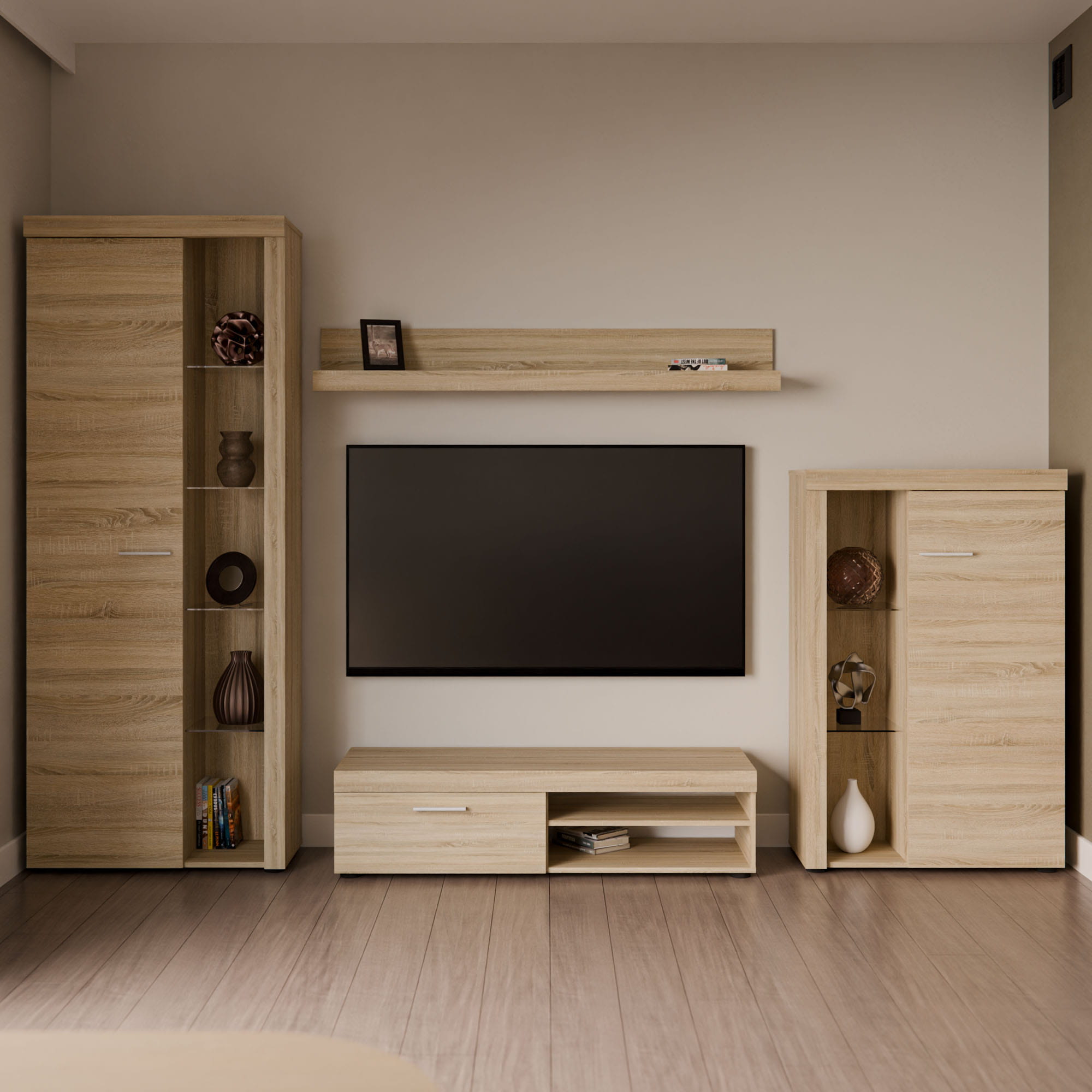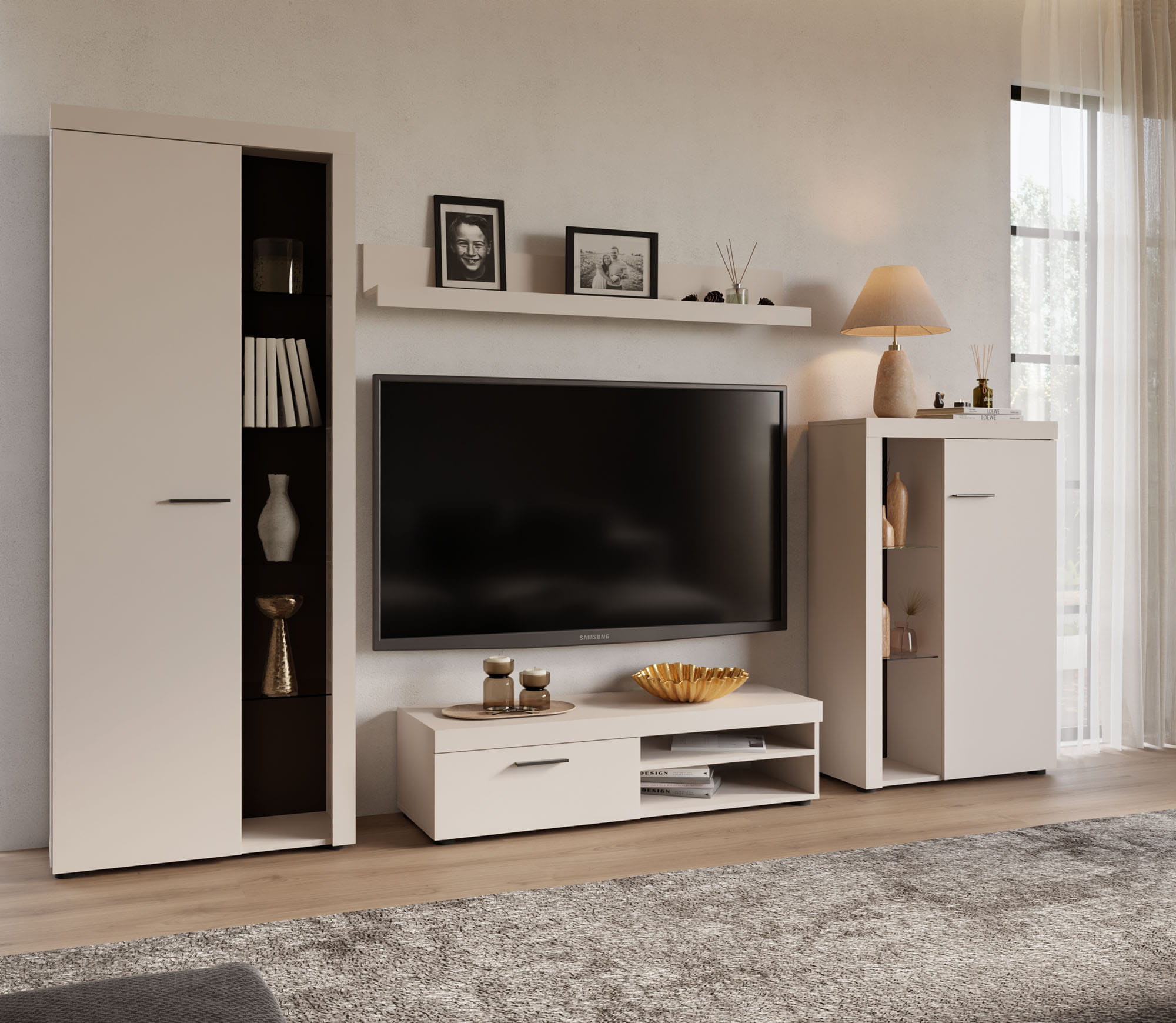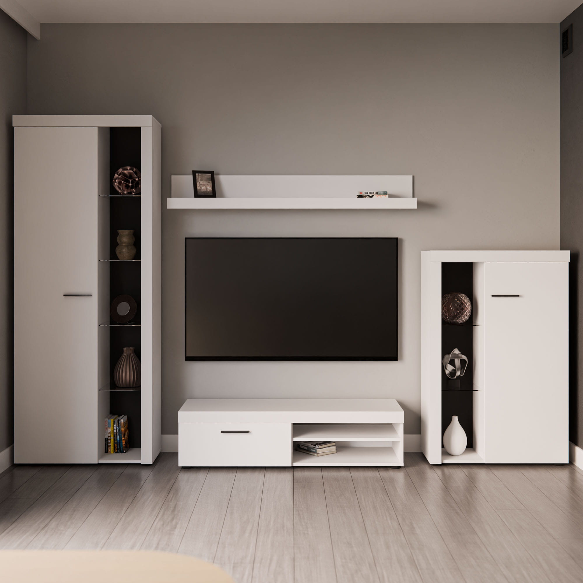 Aby dodatkowo podkreślić urok tych przedmiotów i zbudować w salonie przytulny, wieczorny klimat podczas oglądania filmów, zestaw możesz rozbudować o opcjonalne oświetlenie LED w kolorze białym. Układ zamyka klasyczna półka wisząca, która stanowi idealne miejsce na drobne ramki ze zdjęciami lub opadające rośliny doniczkowe.