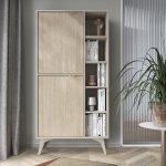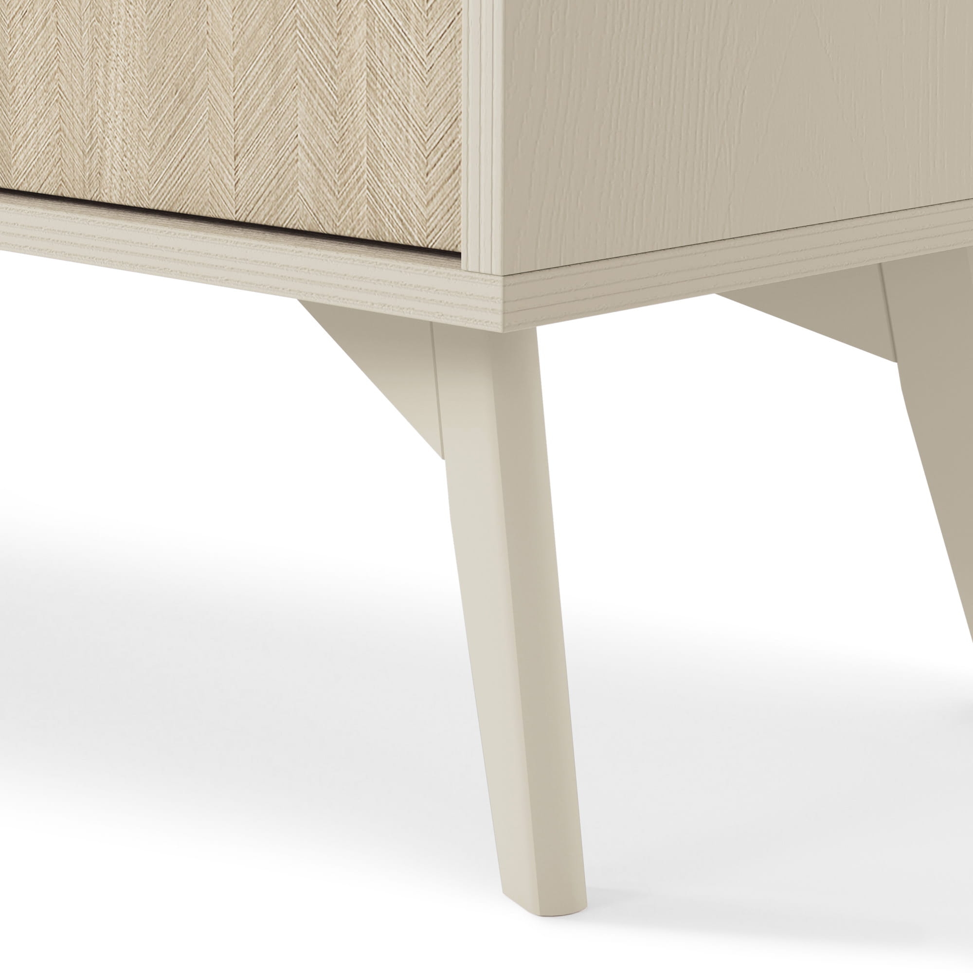 Jego fronty przyciągają uwagę precyzyjnym wzorem jodełki, a do wyboru pozostają dwa wybarwienia: naturalny beż oraz głęboki eukaliptus. Taki design sprawia, że mebel staje się nie tylko praktyczną bazą na domowe zbiory, ale również wyrazistym punktem całej aranżacji, wprowadzając do pomieszczenia harmonię i uporządkowany wygląd.