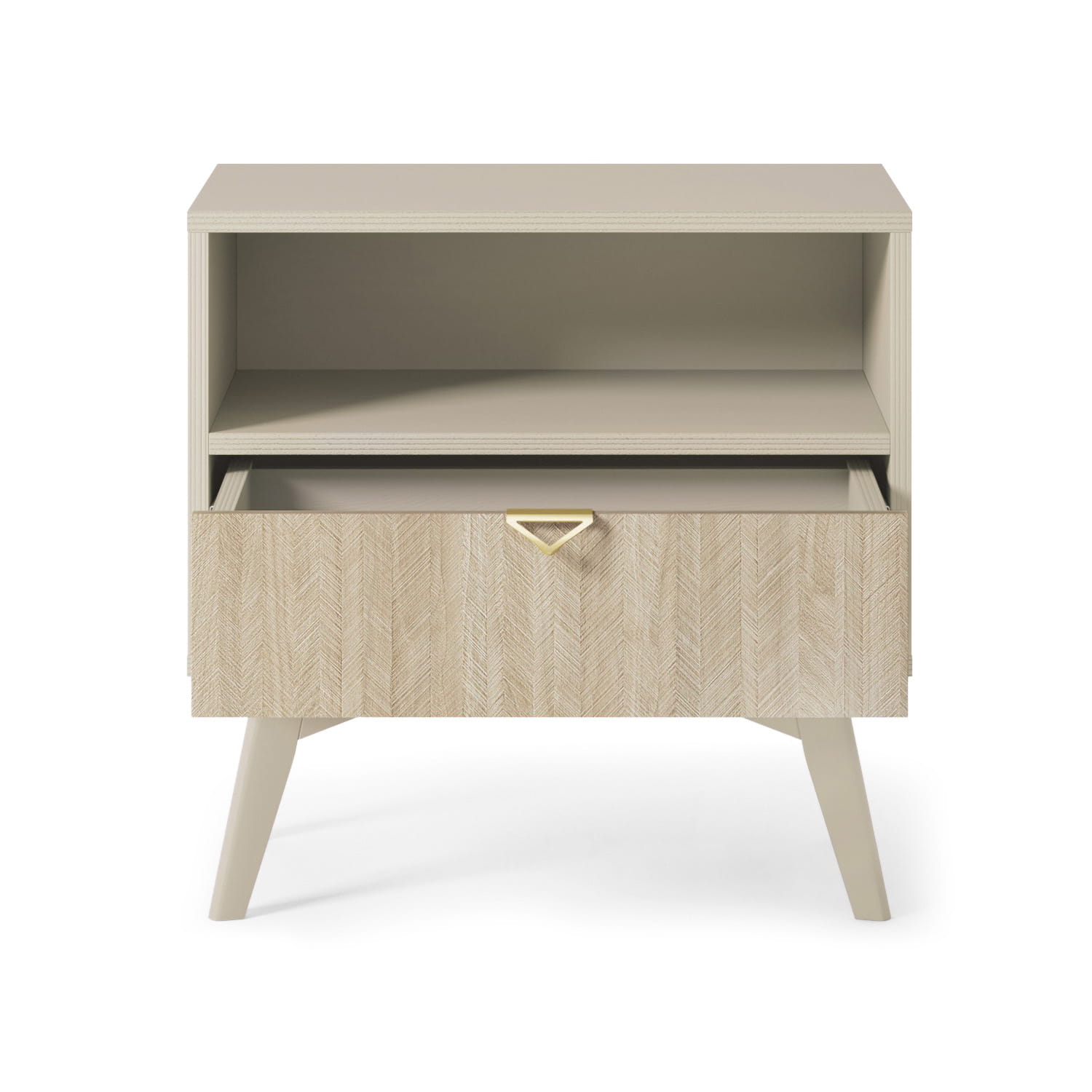 W codziennym użytkowaniu docenisz niezwykle praktyczny układ tego mebla. Tuż pod blatem zaprojektowano otwartą półkę. W domowej praktyce to idealne miejsce, aby tuż przed snem odłożyć czytaną właśnie książkę, okulary czy telefon podłączony do ładowarki, mając je zawsze w zasięgu ręki. Poniżej znajduje się pojemna szuflada wyposażona w system pełnego wysuwu. Wybierając ten stolik nocny z szufladą, zyskujesz natychmiastowy i swobodny dostęp do całej jej zawartości. To doskonała, dyskretna przestrzeń na ukrycie kremu do rąk, opaski na oczy czy leków, po które bez trudu sięgniesz nawet w nocy, nie wstając z łóżka.