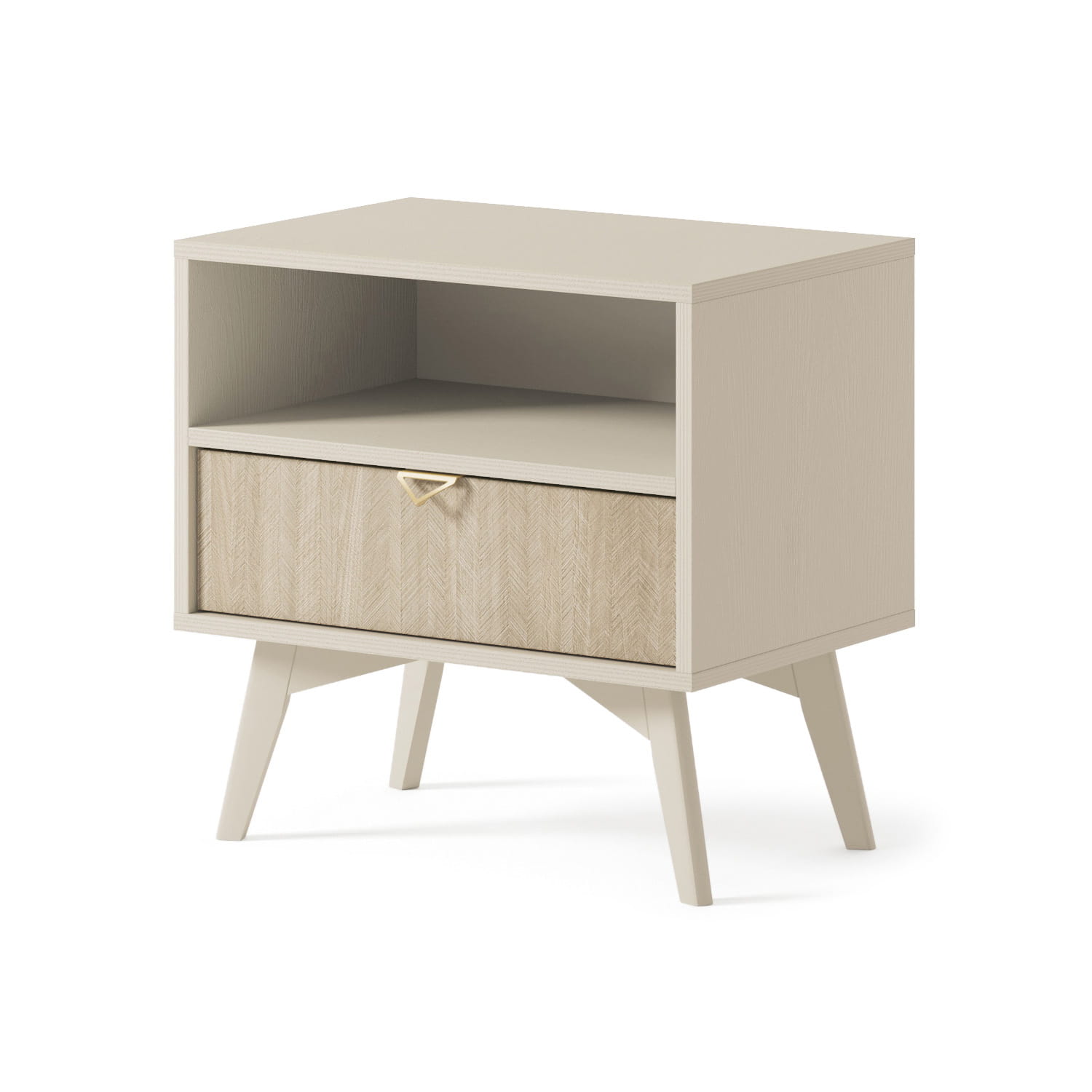 Dbając o higienę w strefie snu, ta szafka nocna na nóżkach została osadzona na stabilnych, drewnianych wspornikach o wysokości aż 19 cm. Taki prześwit to ogromne ułatwienie dla domowników – pozwala na bezproblemowy wjazd każdego robota sprzątającego i szybkie umycie podłogi mopem bez odsuwania mebla.