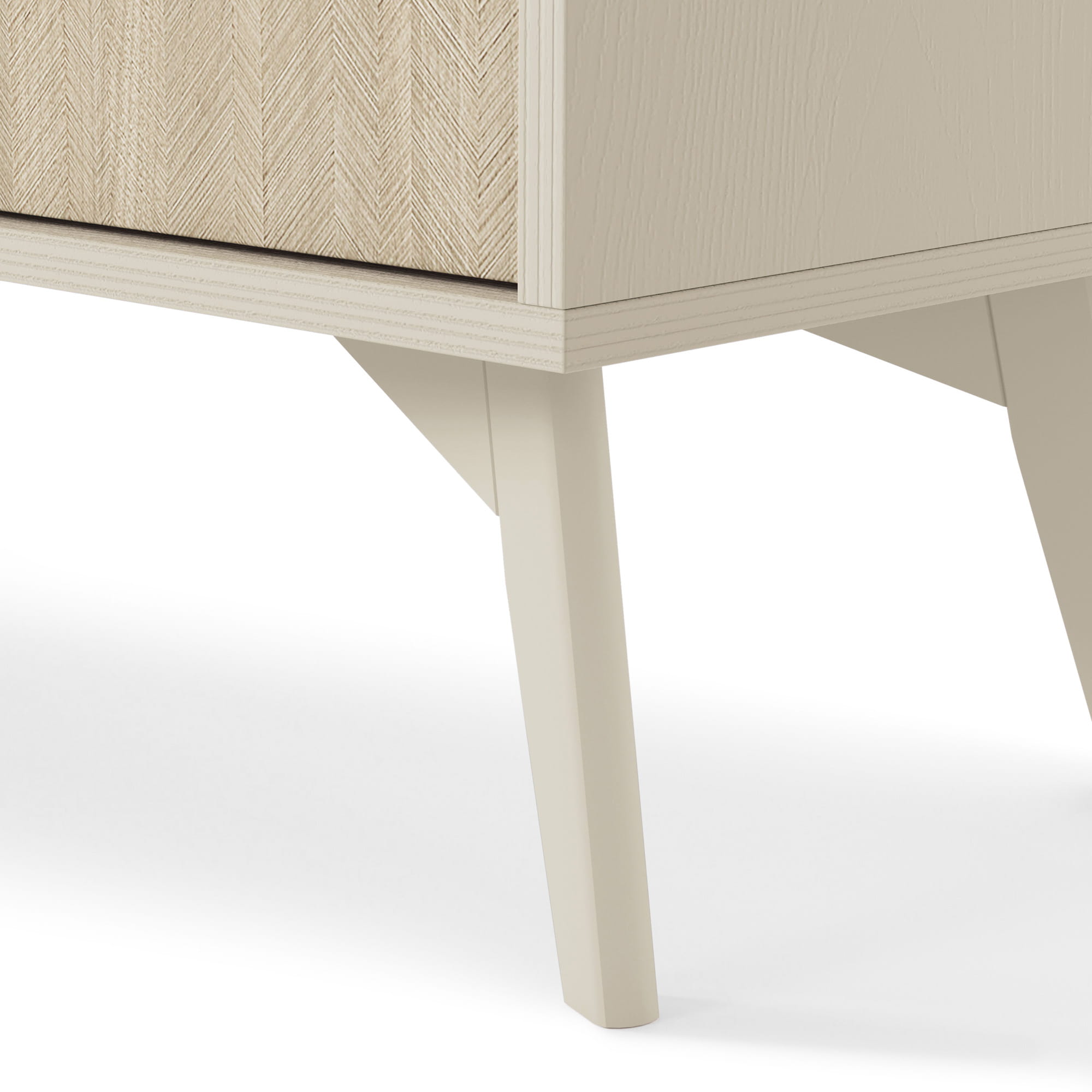 Front mebla przyciąga wzrok precyzyjnym wzorem jodełki, a do wyboru oddajemy dwa warianty kolorystyczne: stonowany beż oraz głęboki eukaliptus. Całość uzupełnia solidny, złoty uchwyt wykonany z aluminium, który stanowi elegancki i wyrazisty detal na gładkiej powierzchni drzwi.
